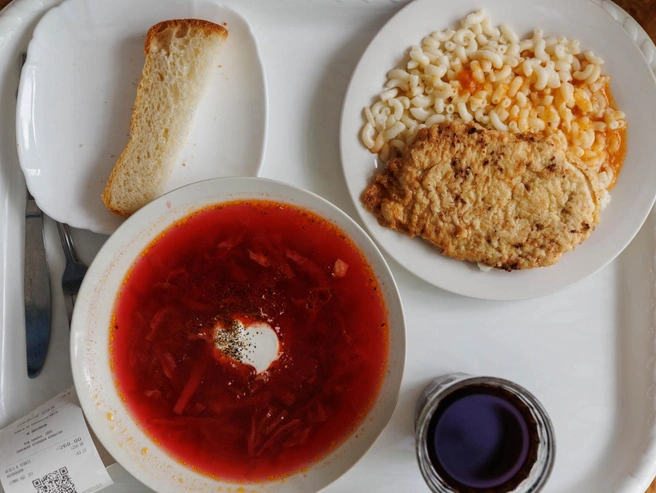 Классические советские обеды, включающие суп, основное блюдо вроде макарон с котлетой и напиток, до сих пор подаются во многих столовых и некоторых современных заведениях.