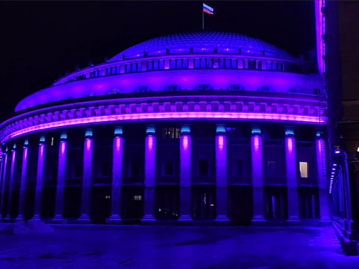 НОВАТ в фиолетовом для акцииФиолетовое освещение театра доступно для просмотра до часа ночи. Это часть ежегодной акции в поддержку недоношенных детей.