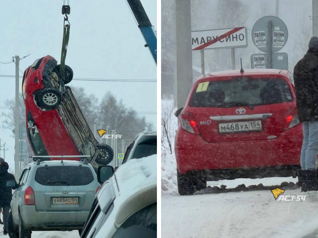 Красная Toyota перевернулась под Новосибирском и повислаВ дорожном происшествии не пострадал ни один человек. Автомобиль приподняли над проезжей частью во время эвакуации.