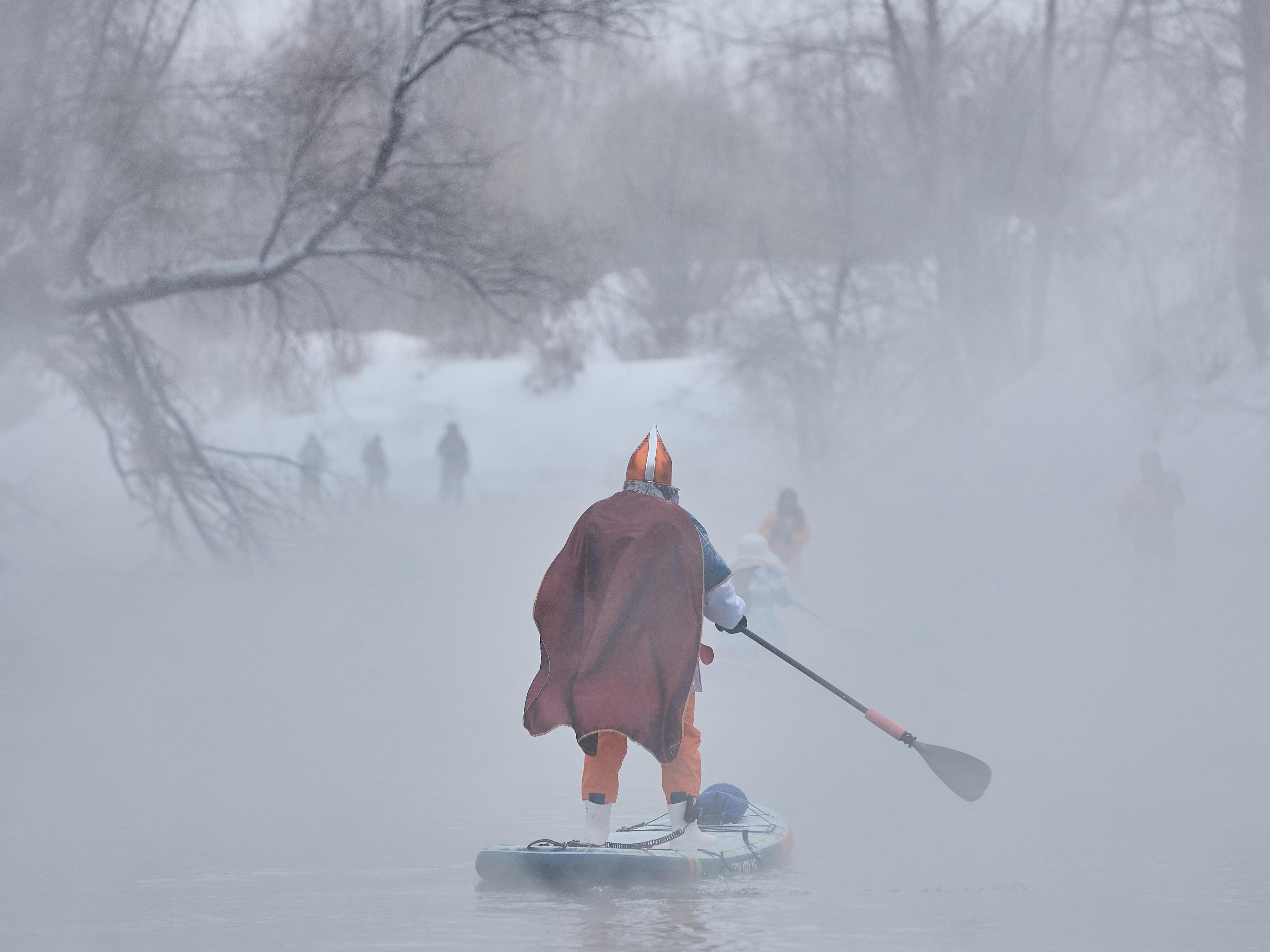 Богатыри и Снегурочки устроили зимний заплыв на сапсерфах по ОбиВ Новосибирске в седьмой раз состоялся традиционный новогодний костюмированный заплыв на сапбордах.