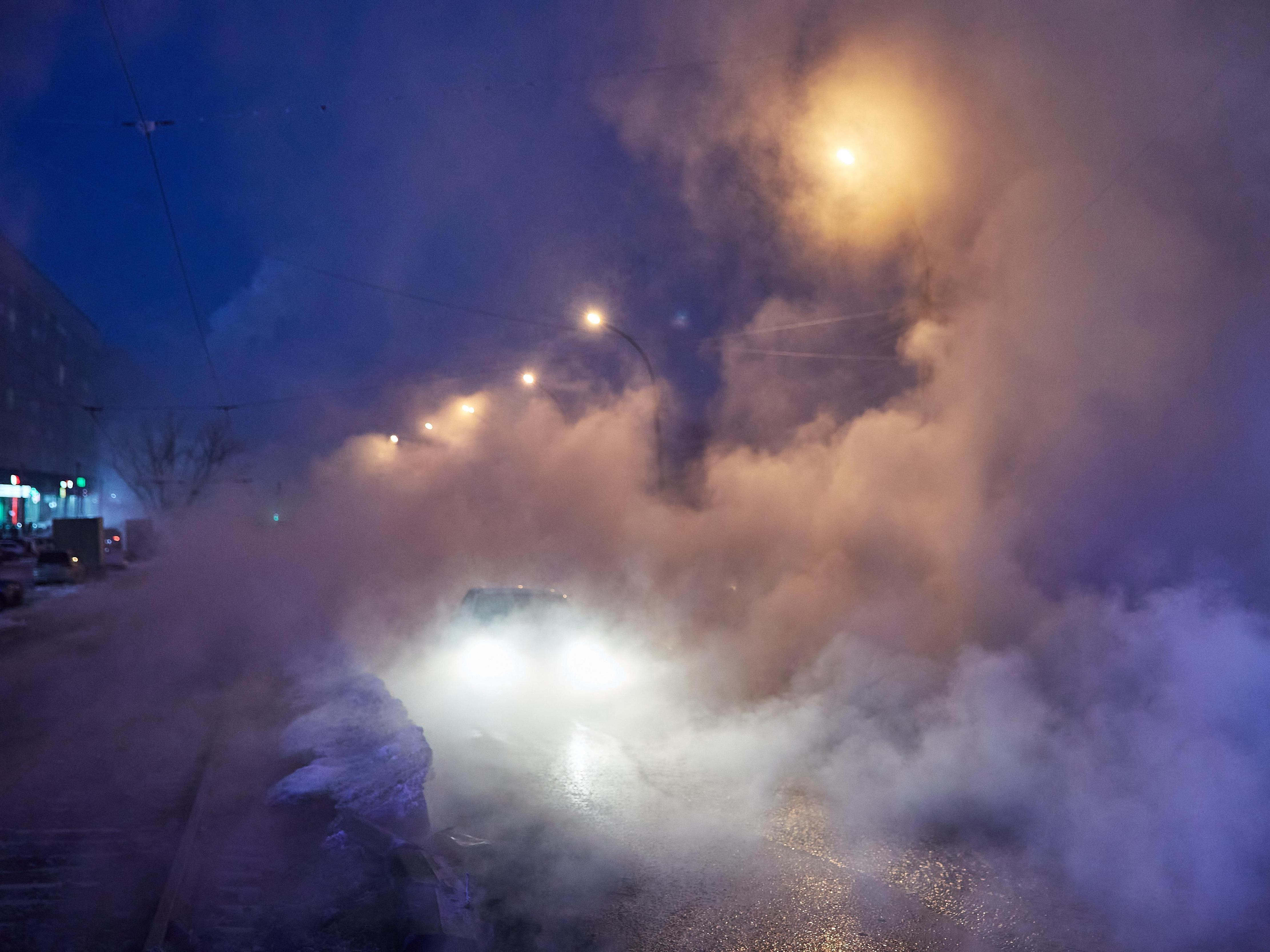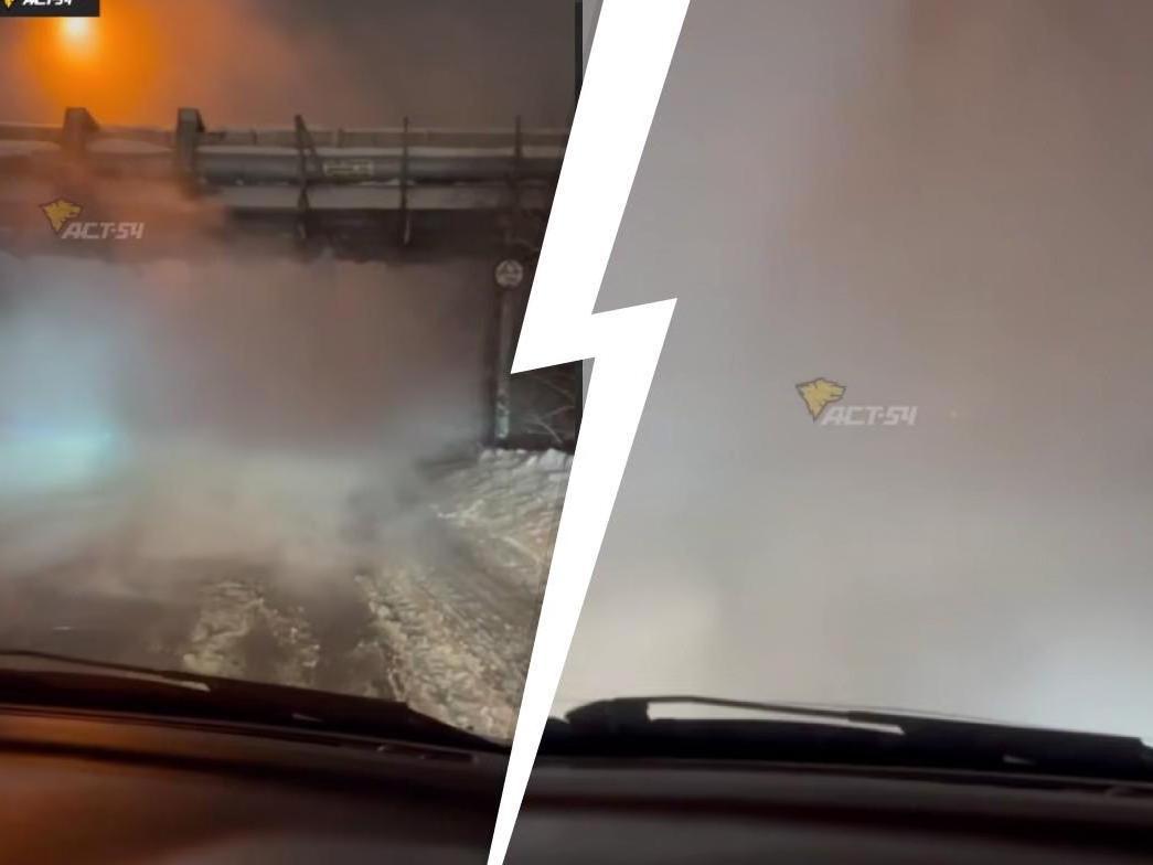 На дороге в Новосибирске нулевая видимость из-за параСамосвал, не опустивший кузов, задел теплотрассу, что привело к сильному выбросу горячей воды и пара.