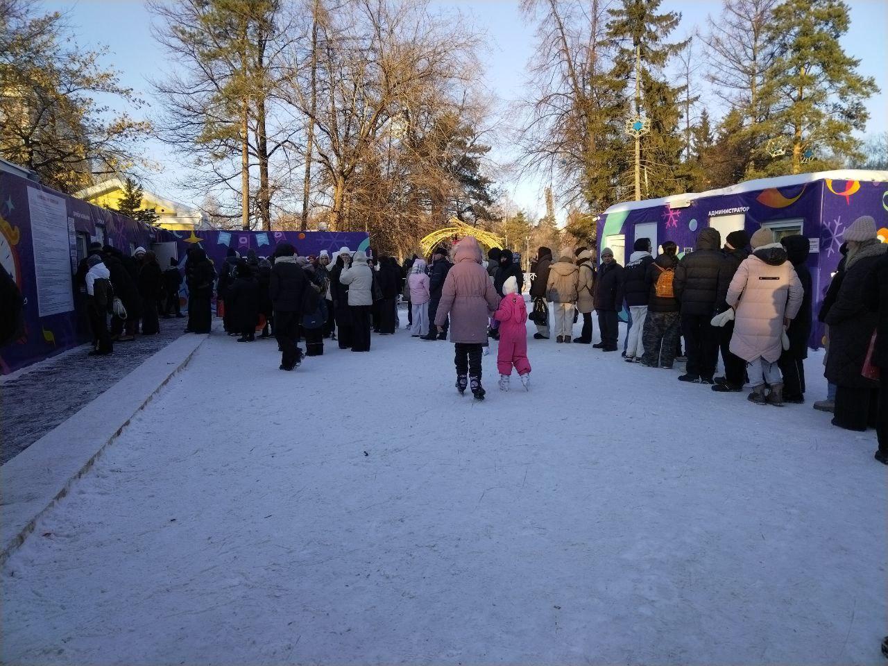 У катка в Центральном парке выстроилась очередьЦелые семьи пришли в Центральный парк, чтобы покататься на коньках, образовав длинную очередь.